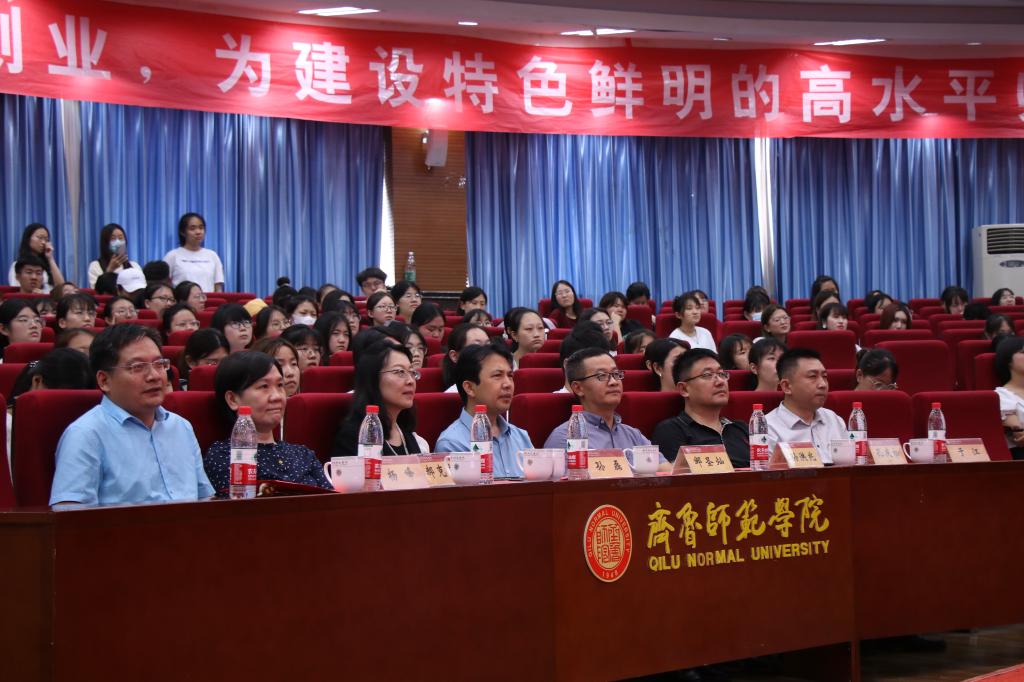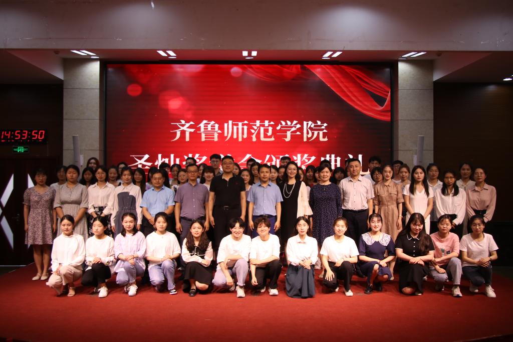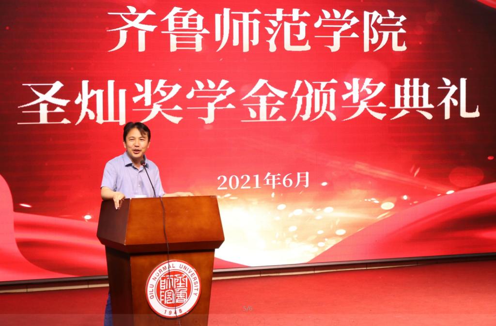 选树先进典型,传递奋斗情怀。6月10日下午,文学院在章丘校区图书馆报告厅隆重举行2021年“圣灿奖学金”颁奖典礼。我校青岛校友会会长、青岛银色世纪健康产业集团有限公司董事长邹圣灿出席活动,学生工作部部长孙磊,团委书记孔庆松,教务处处长孙洪兆,学生工作处副部长、校友办主任郝克宁,文学院院长杨峰,文学院党总支副书记于江及获奖者代表在内的师生共计300余人参加了典礼。