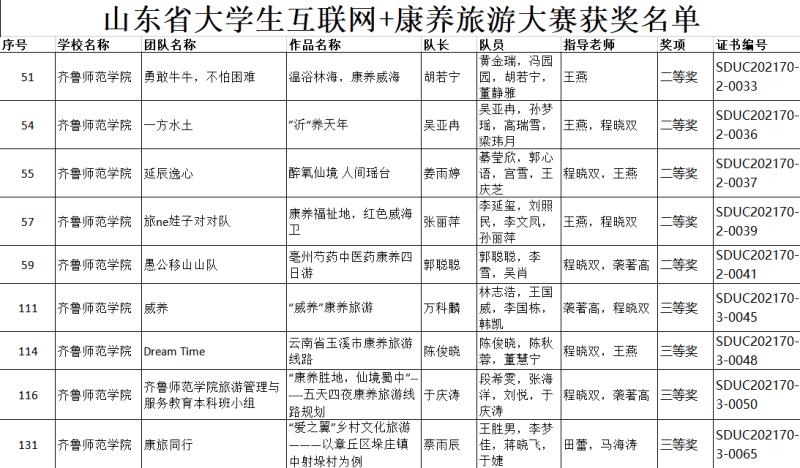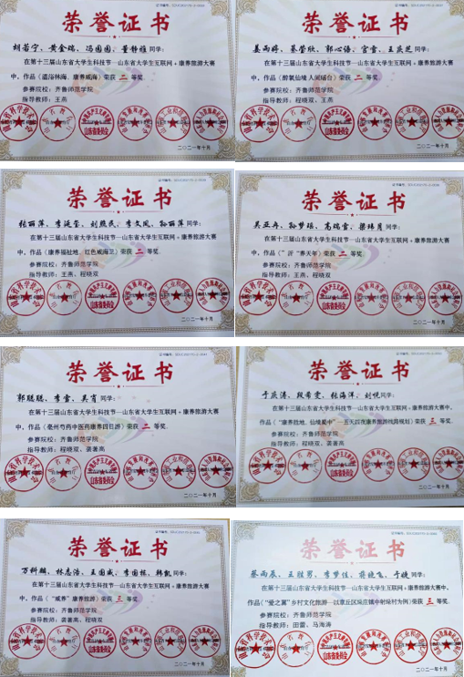 11月6至7日,第十三届山东省大学生科技节之山东省大学生互联网+康养旅游大赛决赛圆满结束。经过初赛筛选,我校参加的九支队伍全部获奖,近60名师生参加此次活动。本次比赛历时四个月,从省级初赛到省级决赛,程晓双、王燕、马海涛、袭著高、田蕾等指导老师带领学生参赛,历史文化学院、教师教育学院全体参赛学生奋力拼博,全心投入,在省级决赛中取得了历史性突破。历史文化学院由胡若宁、吴亚冉、姜雨婷、张丽萍、郭聪聪同学带领的队伍获得二等奖,教师教育学院由万科麟、蔡雨辰同学带领的队伍获得三等奖;历史文化学院于庆涛、陈俊晓同学带领的队伍获得三等奖。