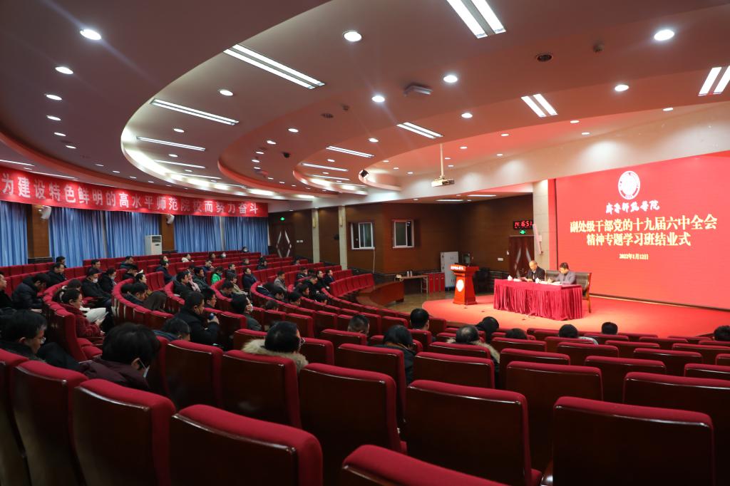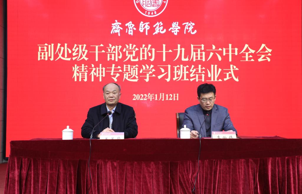 1月12日下午,在章丘校区学术报告厅举行了副处级干部党的十九届六中全会精神专题学习班结业式。党委书记王玉华出席仪式并讲话,全体学员参加了仪式。结业式由党委委员、组织部部长李伯伟主持。