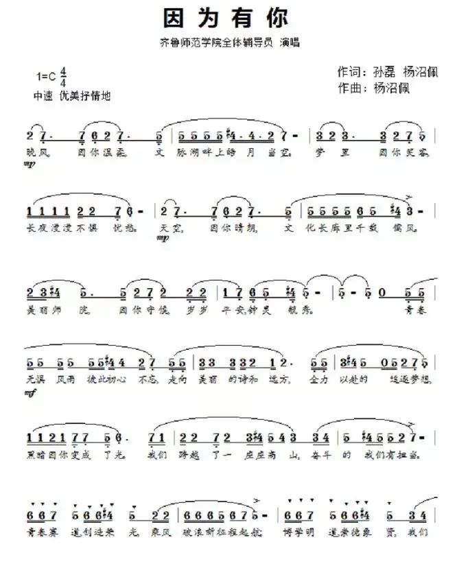 歌曲《因为有你》,由我校辅导员老师原创并由全体辅导员老师集体参与演唱,表达了齐鲁师院全体师生对党和国家的敬仰热爱,对教育事业的忠诚担当,立志“感党恩、守初心、铸师魂、担使命”。歌曲在录制和创作过程中凝聚了全体辅导员老师的集体智慧和力量,他们秉承着“为党育人,为国育才”的使命,在疫情期间坚守一线工作的同时,历时三个多月,精心策划录制了这首歌曲,用自己年轻的力量,践行初心使命。值得一提的是,这首音乐作品邀请了国家一级编剧、词作家和唱片制作人陈道斌老师作为艺术指导,给予大力支持。