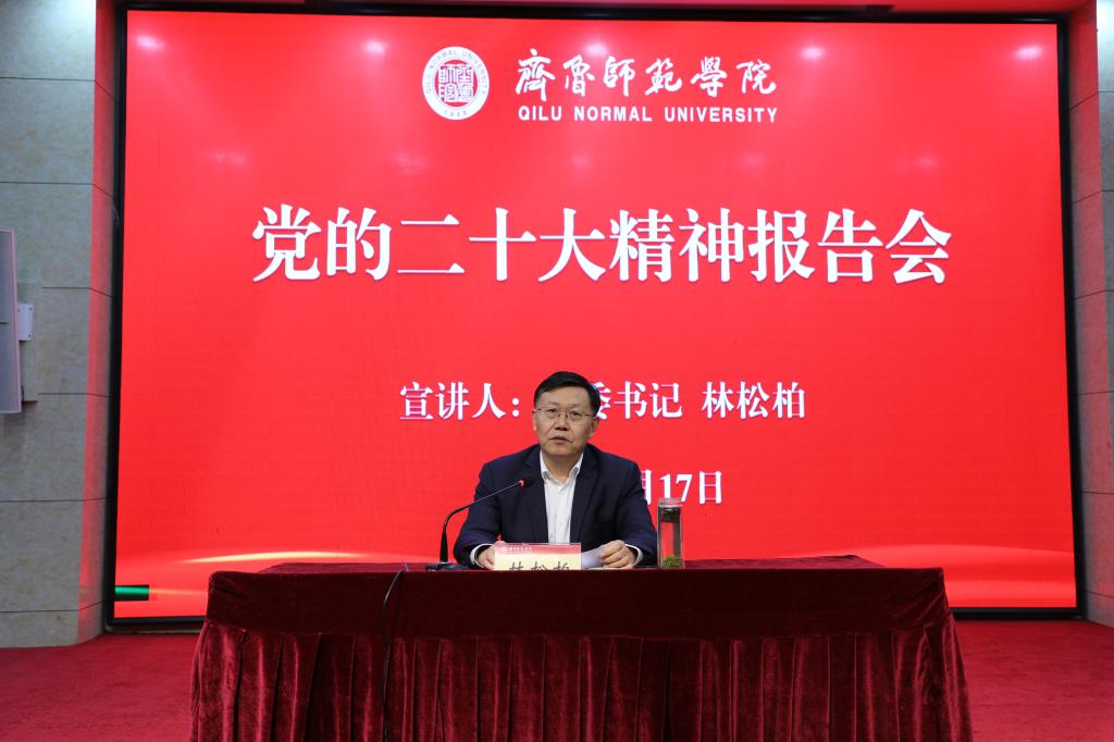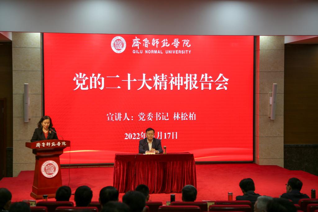 1月17日下午,齐鲁师范学院学习宣传贯彻党的二十大精神首场宣讲报告会在章丘校区图书馆学术报告厅举行。省属高校学习贯彻党的二十大精神宣讲团成员、齐鲁师范学院学习贯彻党的二十大精神宣讲团团长、党委书记林松柏进行宣讲。学校党委副书记赵敏主持宣讲报告会。