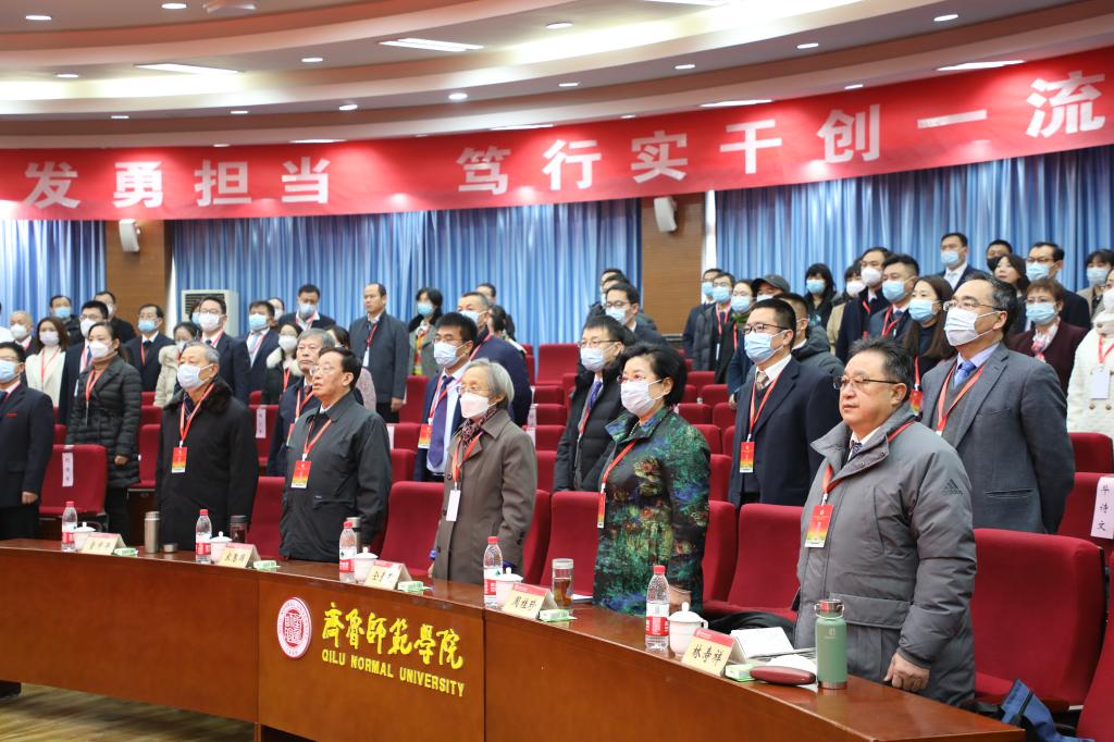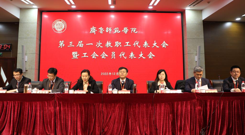 在雄壮的国歌声中,大会拉开帷幕。学校党委书记林松柏致开幕词;山东省教育工会副主席赵晓枫代表省教育工会向大会召开表示热烈祝贺并致辞;副校长张兆明代表学校向大会作《全面落实第三次党代会精神 奋力开创学校内涵式高质量发展新局面》的工作报告;第二届工会委员会书面提交了《服务团结教职工 凝心聚力谋发展》的工作报告。同时,大会书面印发了《齐鲁师范学院职能配置内设机构人员编制“三定”方案(草案)》《齐鲁师范学院绩效工资分配办法(草案)》《齐鲁师范学院职称评聘办法(草案)》审议文件。