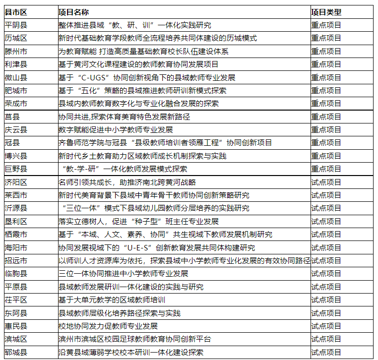 近日,山东省教育厅公布了2022年山东省教师教育协同创新项目名单,确定济南市平阴县等50个县市区为山东省教师教育协同创新项目试点单位,重点项目20项,试点项目30项。我校参与合作申报的项目共有26项获批,其中,获批重点项目12项,试点项目14项。
