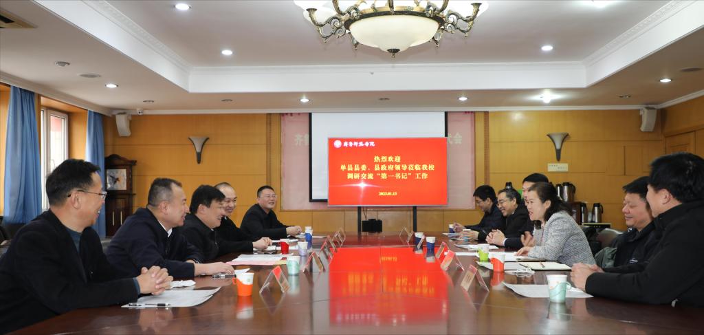 1月13日,菏泽单县县委副书记、县长魏传永一行来我校调研交流“第一书记”工作。学校党委副书记赵敏主持会议,党委委员、组织部部长杨磊,相关部门负责同志以及“第一书记”韩玉柱、阴小建、郭锐、聂文文等参加座谈交流。