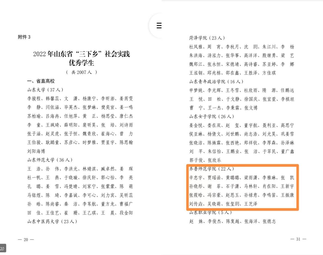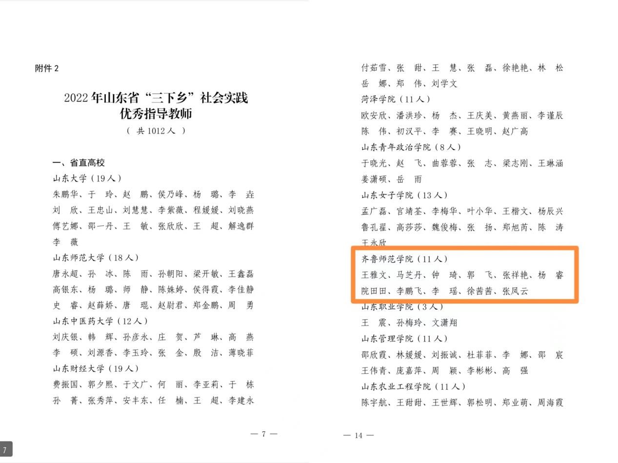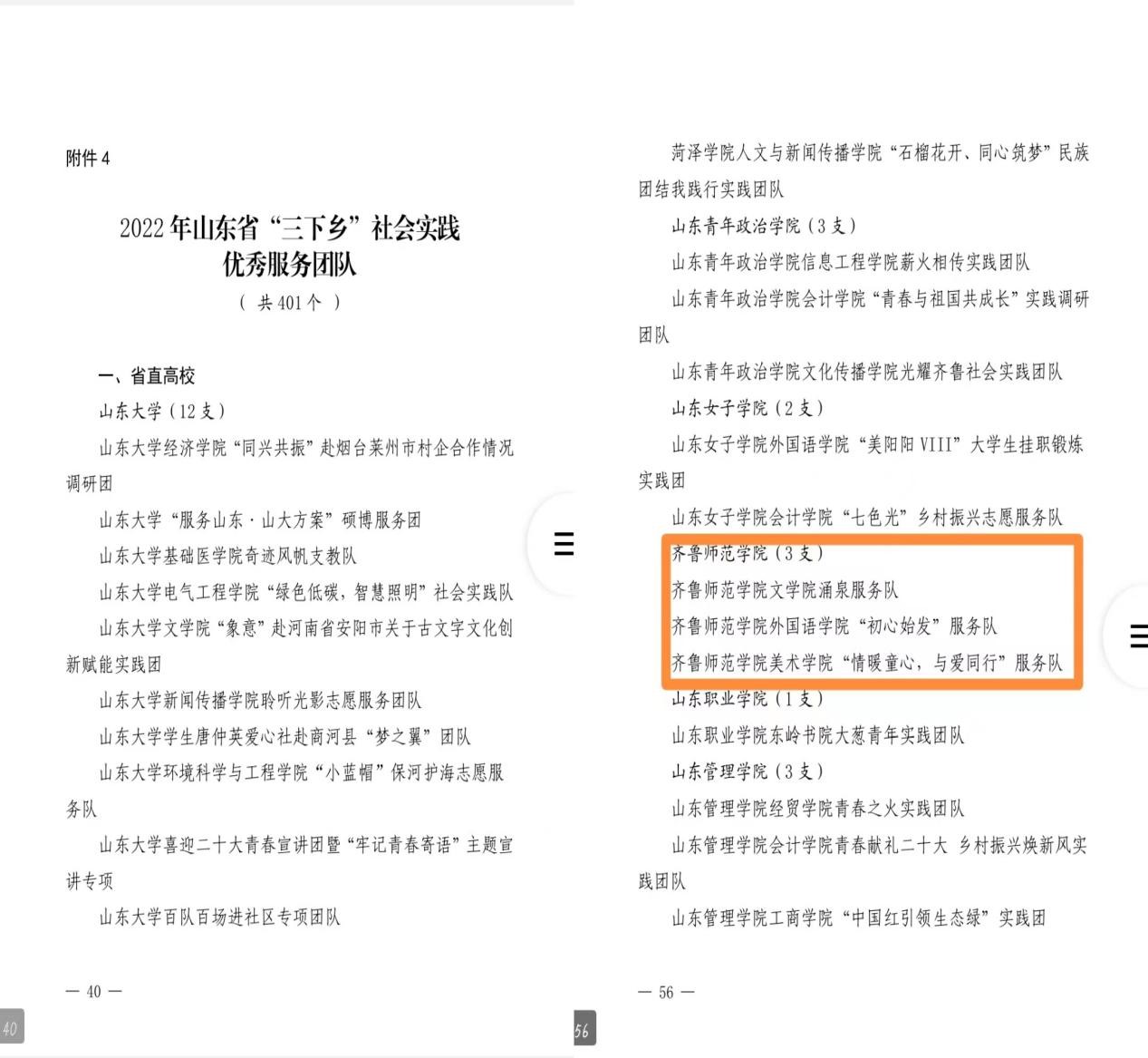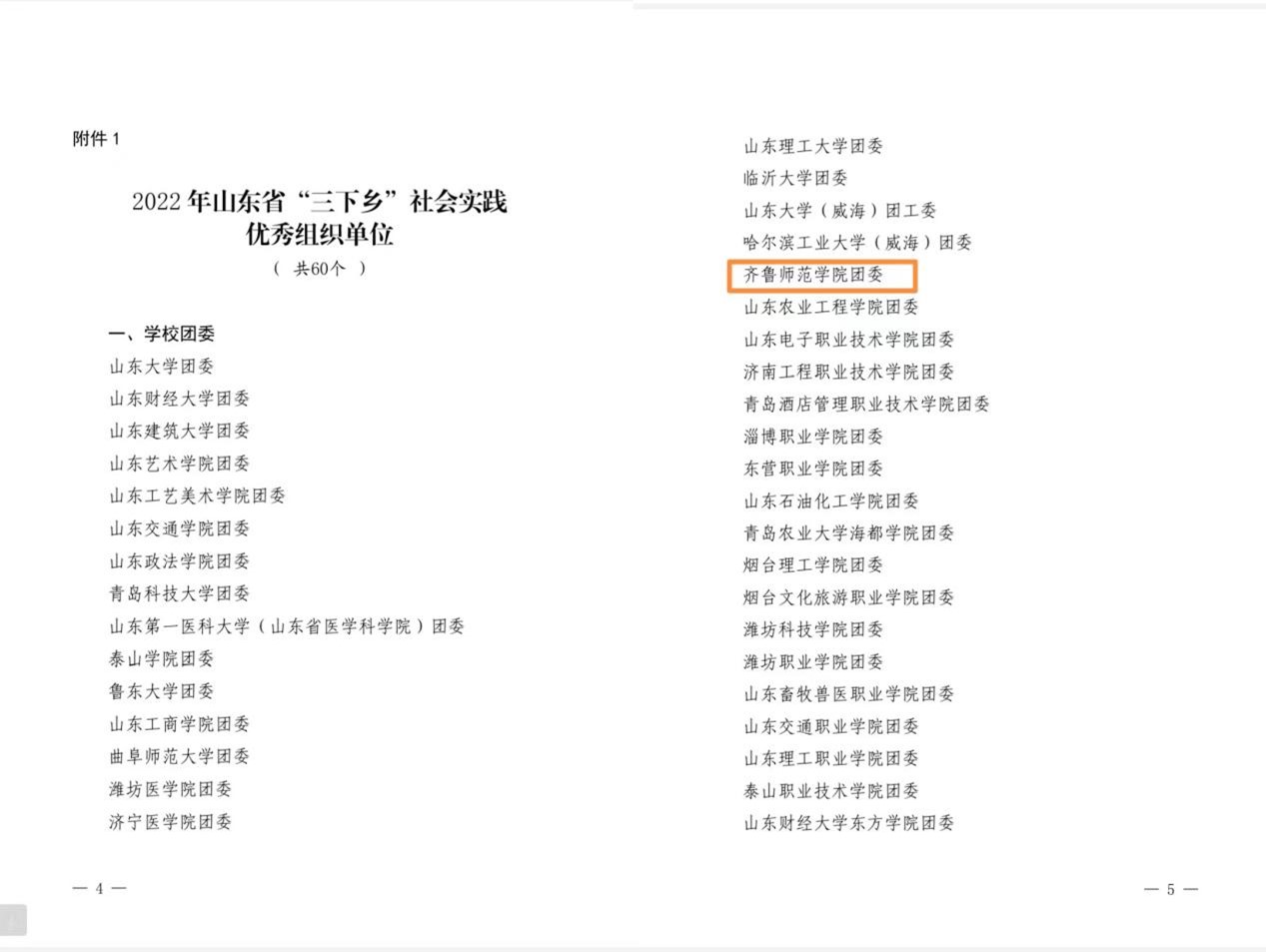 近日,省委宣传部、省文明办、省教育厅、团省委、省学联联合下发《“调研山东”--2022年山东省大中专学生志愿者暑期“三下乡”社会实践活动的通报》,我校荣获“优秀组织单位”,王雅文、马芝丹等11人荣获“优秀指导教师”,辛忠宇、贾瑶函等22人荣获“优秀学生”,文学院涌泉服务队、外国语学院“初心始发”服务队、美术学院“情暖童心,与爱同行”服务队荣获“优秀服务团队”。
