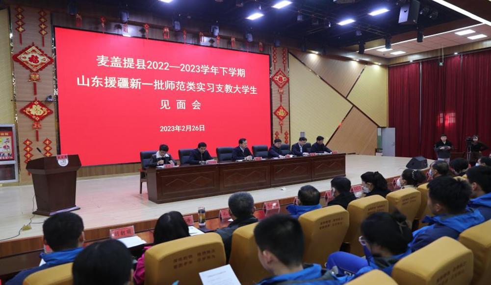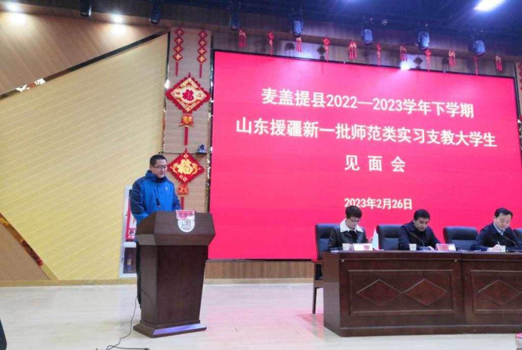 2023年2月26日,新疆麦盖提县2022-2023学年下学期山东援疆新一批师范类实习支教大学生见面会召开,齐鲁师范学院援疆实习支教团全体师生参加会议。麦盖提县委常委、副县长,日照援疆指挥部党委副书记、副指挥许洋出席会议并讲话,麦盖提县政协副主席、教育工委副主席、教育局党委副书记何军致辞。齐鲁师范学院实习支教大学生带队教师代表王通,实习支教大学生代表张新昕进行发言。会议由麦盖提县教育局党组副书记、局长玉苏甫江·艾合买提主持。