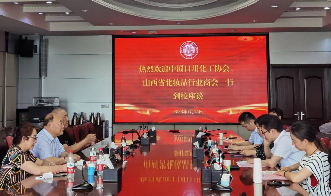 7月14日下午,中国日用化工协会理事长王万绪、山西省化妆品行业商会会长杜智勇、中国日用化工协会副理事长兼秘书长徐茹受邀到校访问,校党委委员、副校长孙正热情接待来访。双方举行交流座谈,化学与化工学院院长曹晓荣、副院长张旭雪、化妆品中心主任骆兴伟和化妆品中心部分骨干教师参加交流座谈。会议由曹晓荣主持。