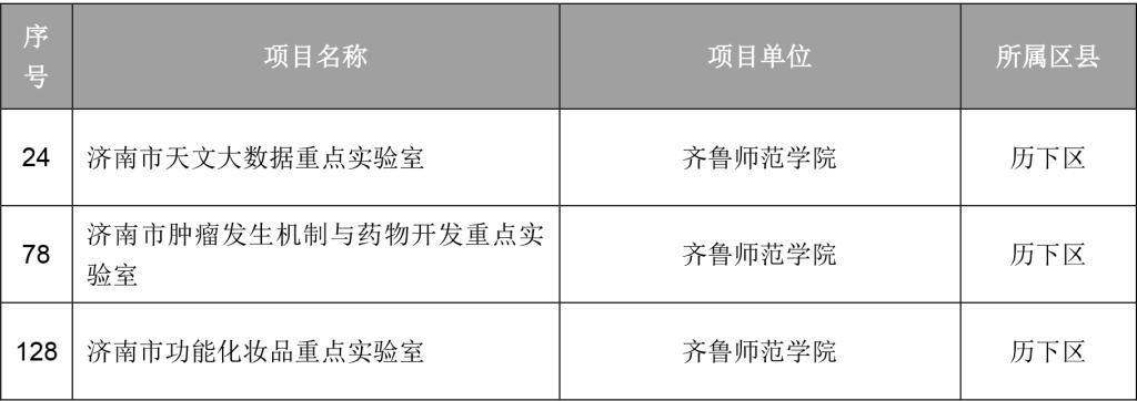 据济南市科学技术局《关于2023年济南市重点实验室拟备案名单的公示》,齐鲁师范学院肿瘤发生机制与药物开发重点实验室、天文大数据重点实验室、功能化妆品重点实验室同时获批济南市重点实验室,这也是学校首次获批济南市该类科研平台。