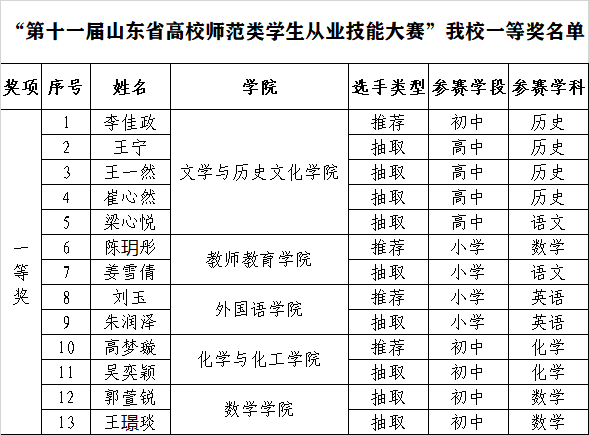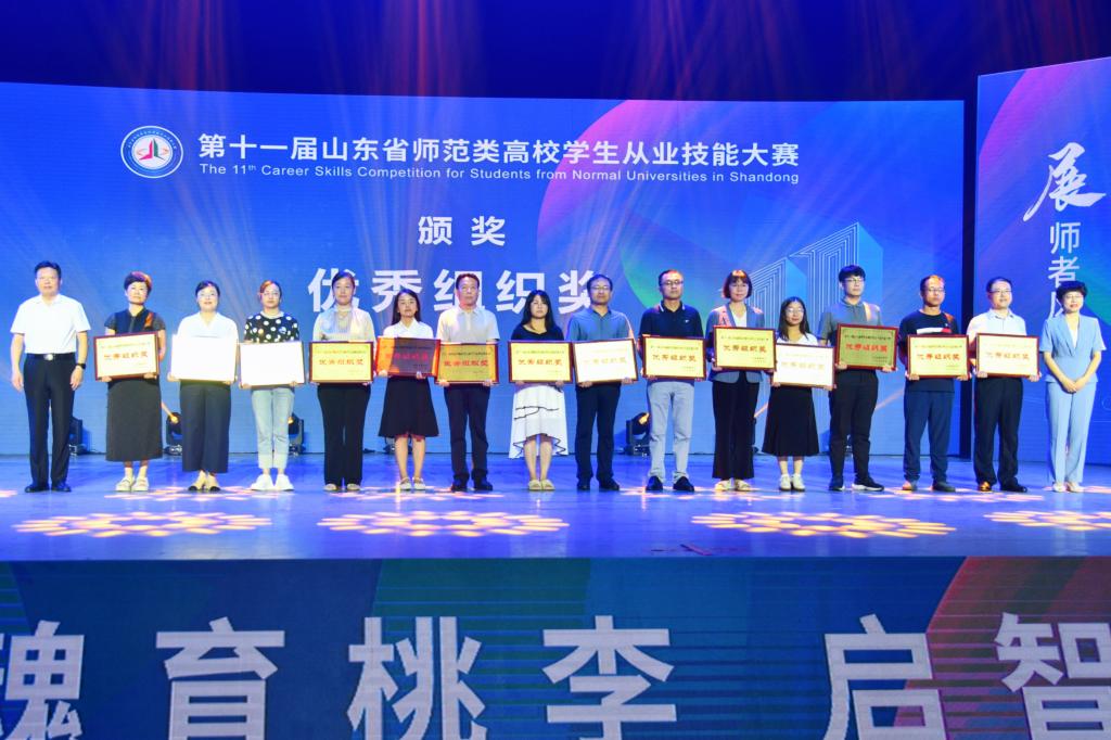 7月19日至23日,第十一届山东省师范类高校学生从业技能大赛决赛在青岛大学举办,共有来自全省55所高校的794名选手竞争较量。齐鲁师范学院参加决赛的52名选手经过激烈角逐,最终获奖44人,其中李佳政等13名同学获得一等奖、乔佳怡等15名同学获得二等奖、何鑫苑等16名同学获得三等奖,李爽等10人荣获优秀辅导教师称号,学校再次荣获优秀组织奖。