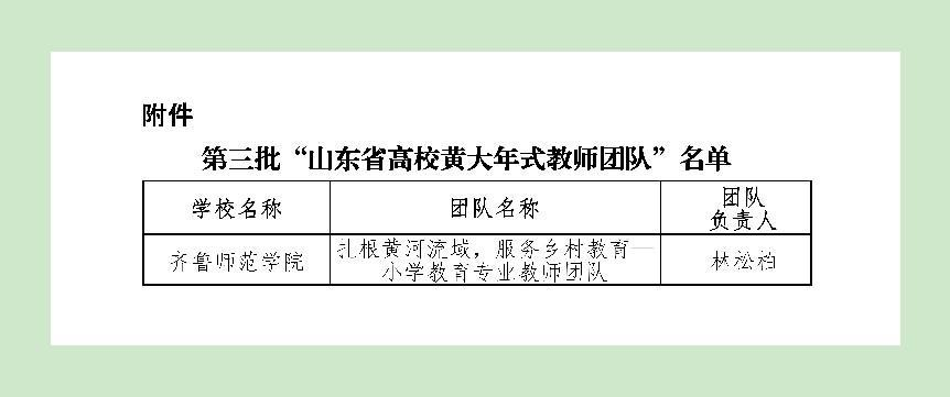 近期,山东省教育厅发布了《关于公布第三批“山东省高校黄大年式教师团队”名单的通知》,齐鲁师范学院“扎根黄河流域,服务乡村教育—小学教育专业教师团队”获批第三批“山东省高校黄大年式教师团队”。