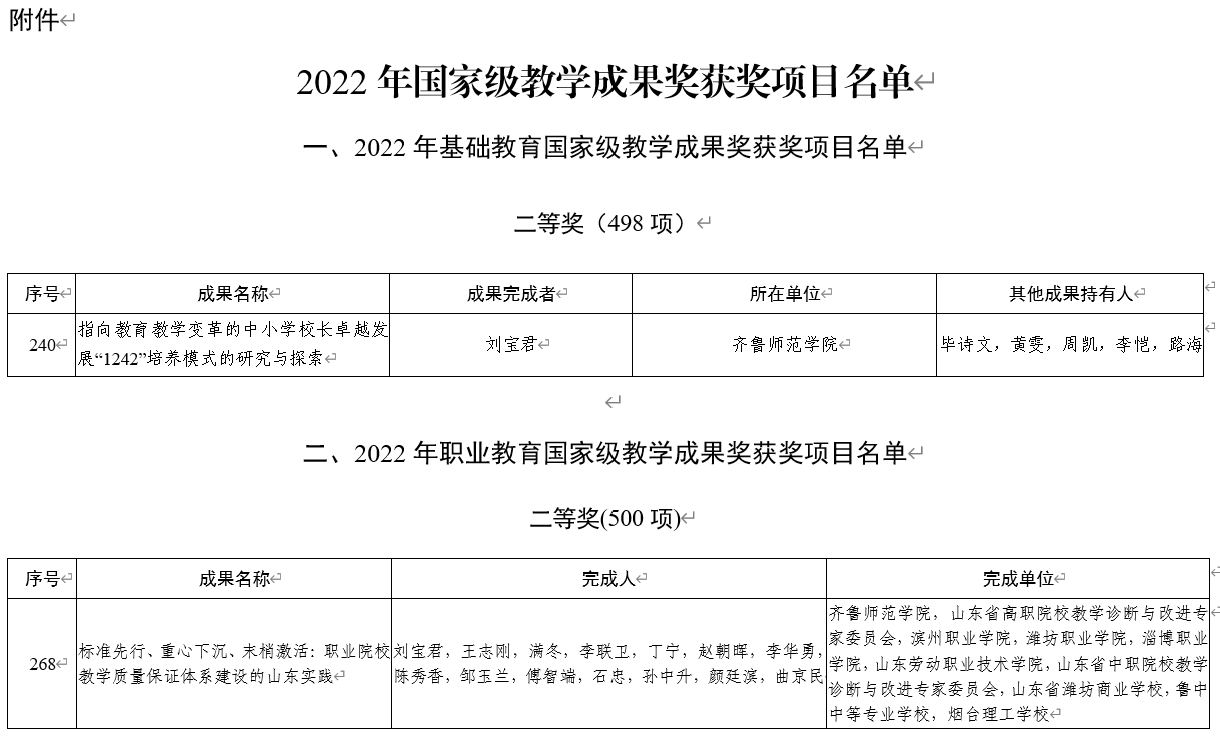 近日,教育部公布了2022年国家级教学成果奖获奖名单。齐鲁师范学院刘宝君教授团队的《指向教育教学变革的中小学校长卓越发展“1242”培养模式的研究与探索》《标准先行、重心下沉、末梢激活:职业院校教学质量保证体系建设的山东实践》分别获得基础教育、职业教育类二等奖。