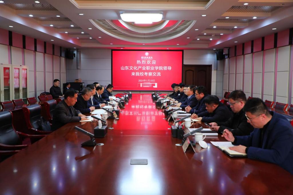 1月10日下午,山东文化产业职业学院董事长李京平,校长曹胜强,党委副书记、副校长姜雪松等一行6人来校考察交流。党委书记林松柏,党委副书记、校长郑秀文,党委委员、副校长孙正热情接待来访。双方就人才培养、学科建设、教育资源开发与利用等举行座谈。座谈会由郑秀文主持。