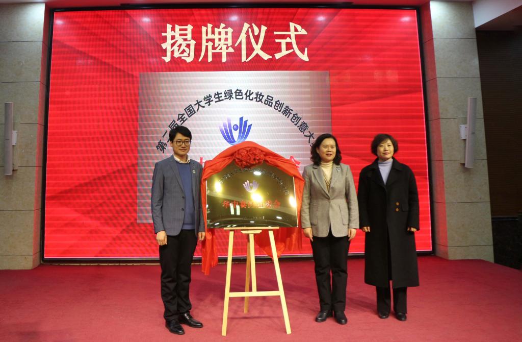 赵敏,中国抗衰老促进会化妆品产业分会会长、第二届全国大学生绿色化妆品创新创意大赛组委会执行主席程伟,齐鲁师范学院化学与化工学院院长曹晓荣共同为华中赛区组委会揭牌。