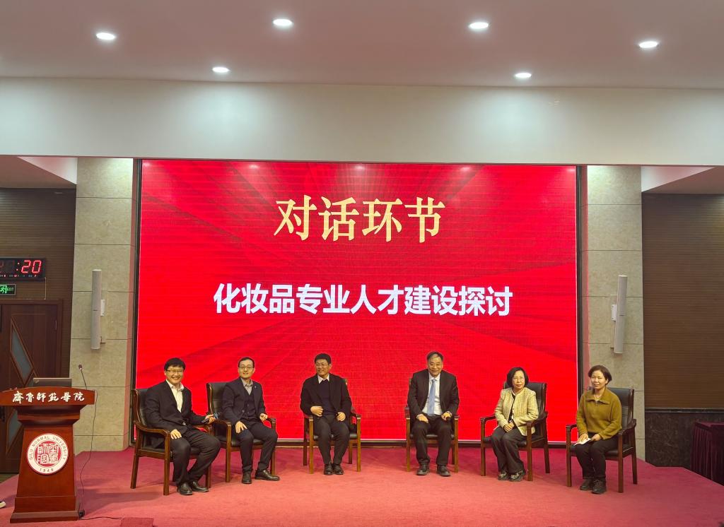 在主题的对话环节,姬胜利、李洪光、焦培福、齐鲁工业大学化妆品学科带头人王领、山东福瑞达生物股份有限公司副总经理杨素珍、山东省日化行业协会化妆品分会副主任王玉玲围绕“化妆品专业人才建设探讨”这一主题,展开讨论并与现场学生积极互动交流,详细解答了同学们关心的专业学习、求职就业、见习实习、能力提升等问题,现场气氛热烈活跃。