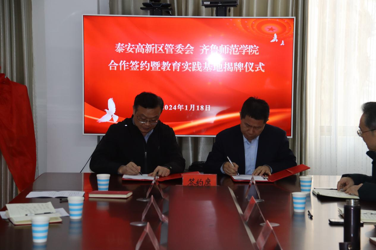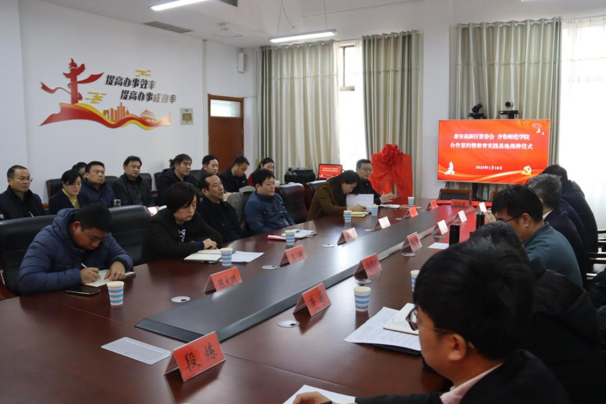 为积极推进校地合作,1月18日,齐鲁师范学院副校长张兆明一行赴泰安高新技术产业开发区对接合作,泰安高新区党工委副书记、教育工委书记姚来新,泰安市教育局总督学杜平等出席会议。会上举行齐鲁师范学院泰安高新区教育实践基地揭牌仪式,并签署基础教育合作协议。会议由泰安高新区教育工委副书记王文强主持。