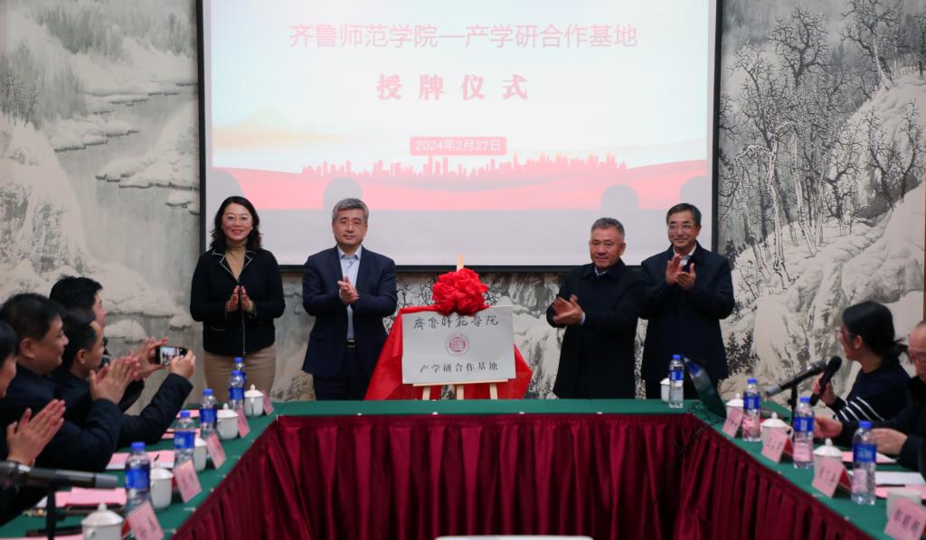 张兆明、孙磊、郜明超、陈俊杰共同为齐鲁师范学院产学研合作基地揭牌。