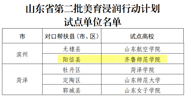 学校高度重视美育工作,出台了加强新时代美育工作的实施意见,构建体现新时代特征的美育教育体系,积极探索建立高校支持中小学美育协同发展机制。学校组建了由校长郑秀文主抓,教务处牵头,党委宣传部、学生工作部(处)、团委、音乐学院、美术学院等多部门协同的工作小组。最终,齐鲁师范学院成功入选,对口帮扶滨州市阳信县。
