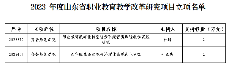 近日,山东省教育厅公布了2023 年山东省本科教学改革研究项目立项名单、2023 年山东省职业教育教学改革研究项目立项名单。齐鲁师范学院获批5项山东省本科教学改革研究项目和2项山东省职业教育教学改革研究项目。