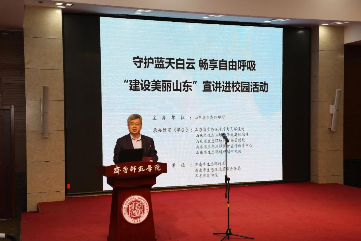为贯彻落实习近平生态文明思想,进一步加强生态文明宣传教育,增强广大青少年环境保护意识,3月26日上午,由山东省生态环境厅主办的“守护蓝天白云·畅享自由呼吸——‘建设美丽山东’宣讲进校园”活动在齐鲁师范学院章丘校区举行。山东省生态环境厅二级巡视员张金智,学校副校长张兆明党委委员、党委组织部部长杨磊出席活动并致辞,省、市、区生态环境部门有关人员和学校师生代表约200余人参加活动。