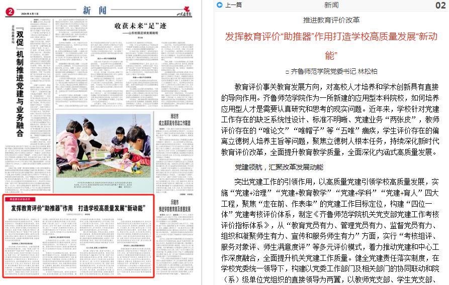 该报用四分之一版的篇幅,从“党建领航,汇聚改革发展动能”“立破并举,深化教师评价改革”“以人为本,改革人才培养评价”“护航育人,健全质量保障体系”四个方面,较为详实地梳理了齐鲁师范学院作为一所新建应用型本科高校,在培养应用型人才问题上所做的教育评价改革工作和创新研究。针对党建工作存在的缺乏系统性设计、标准不明晰、党建业务“两张皮”等现象,教师评价存在的“唯论文”“唯帽子”等“五唯”痼疾,学生评价存在的偏离立德树人培养主旨等问题,学校聚焦立德树人根本任务,持续深化新时代教育评价改革,全面提升教育教学质量,全面深化内涵式高质量发展。