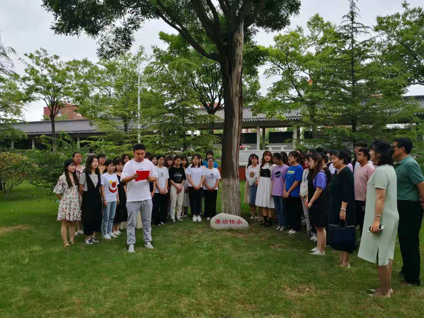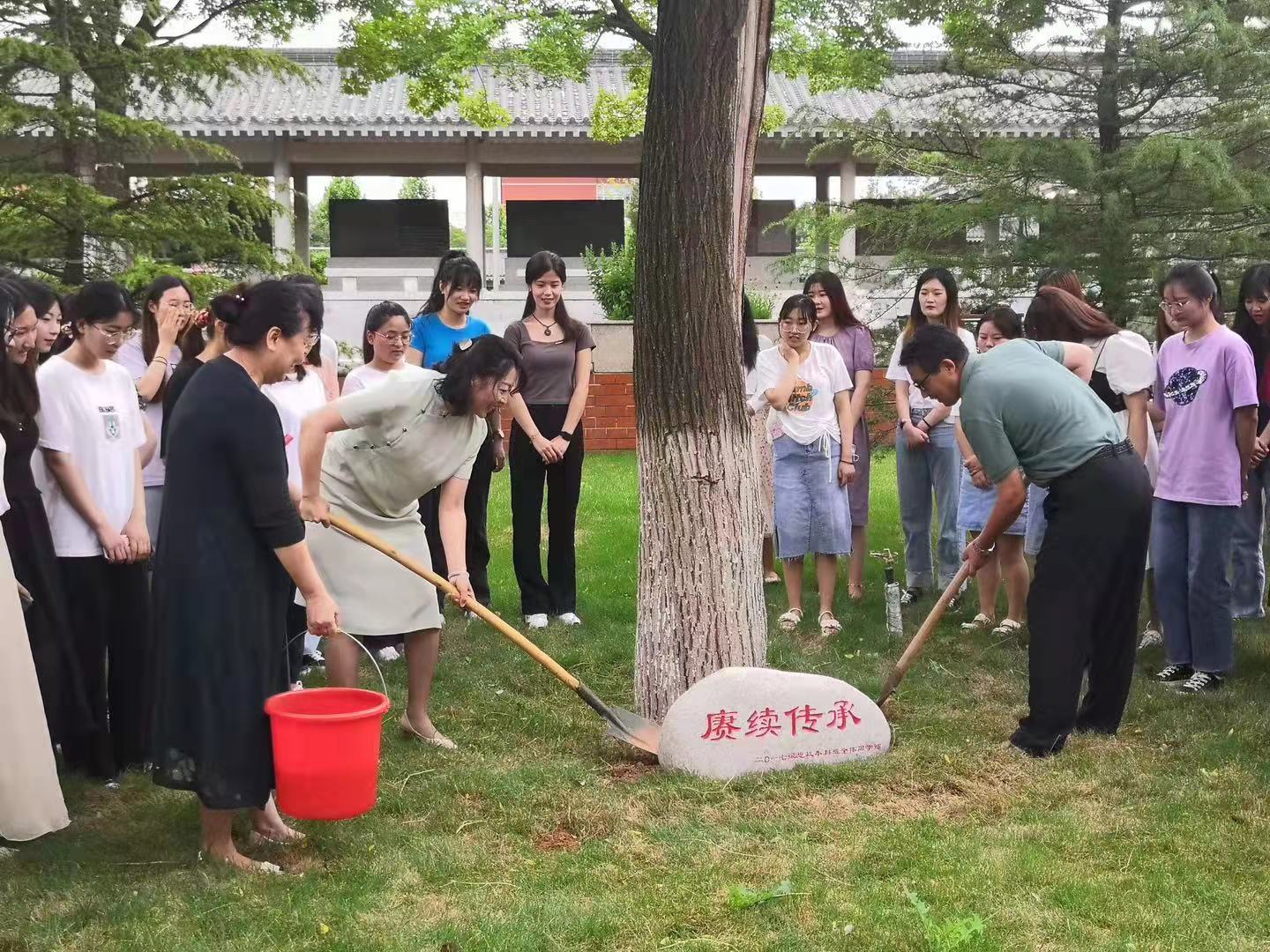 给母校献一抹绿色,留后人一片绿荫。四年来,2021届思政学生团结奋进,一路拼搏,在学校领导、学院老师的关怀和帮助下,取得了一个又一个优异成绩,今年本班的考研录取率也突破至88%,这一切离不开学校、学院和各位老师的帮助。2017级思想政治教育本科班团支书桑玉宁在发表感言时说,作为新时代大学生,我们要常怀感恩之心,我们将对学校的不舍、对学校和老师的感激之情寄托在国槐之上,希望我们学校、希望马克思主义学院能像这颗树一样枝繁叶茂、茁壮成长。