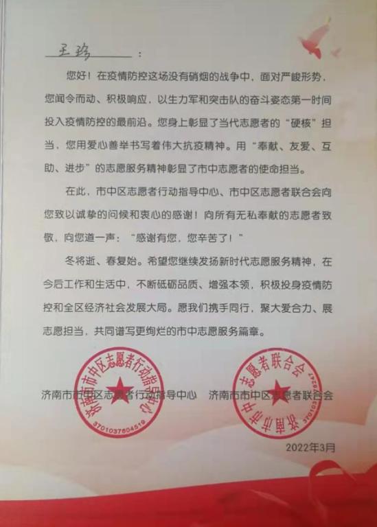 “在疫情防控这场没有硝烟的战争中,面对严峻形势,您闻令而动、积极响应,以生力军和突击队的奋斗姿态第一时间投入疫情防控的最前沿......”这是济南市市中区志愿者行动指导中心发来的感谢信中的内容。疫情发生时,王珍同学正在校外的“专升本”培训机构备考,她第一时间报名参加了培训班所在驻地的疫情防控志愿工作,为打赢疫情防控阻击战贡献自己的力量。