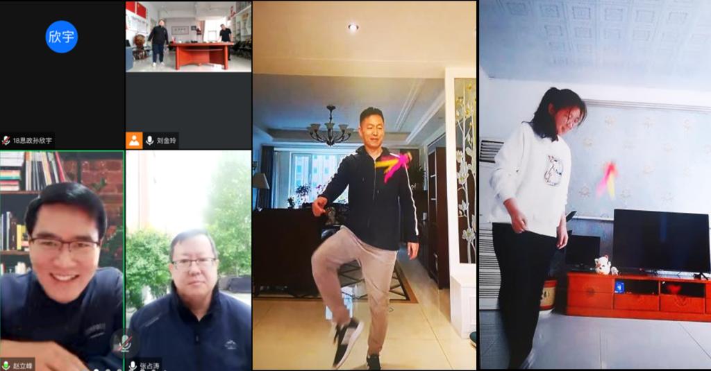 活动伊始,马克思主义学院院长赵立峰亲切问候全体教职员工,热情洋溢地鼓励老师们居家工作同时注重强身健体、丰富生活、劳逸结合、提高效能。马院教师要通过加强体育锻炼,不断提高身体素质,以更饱满的精神状态、更强大的体能储备投入教学科研工作中,以个人最佳姿态向学生积极传递正能量,以强健体魄守护陪伴家人营造和谐幸福家庭氛围。全体教职员工相互在线打招呼,居家学习的孩子们也纷纷出现在摄像头前,虽身处不同地点,但“全院共此时”的温馨与快乐尽情洋溢,欢声笑语不绝于耳。
