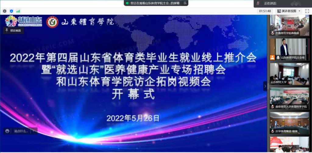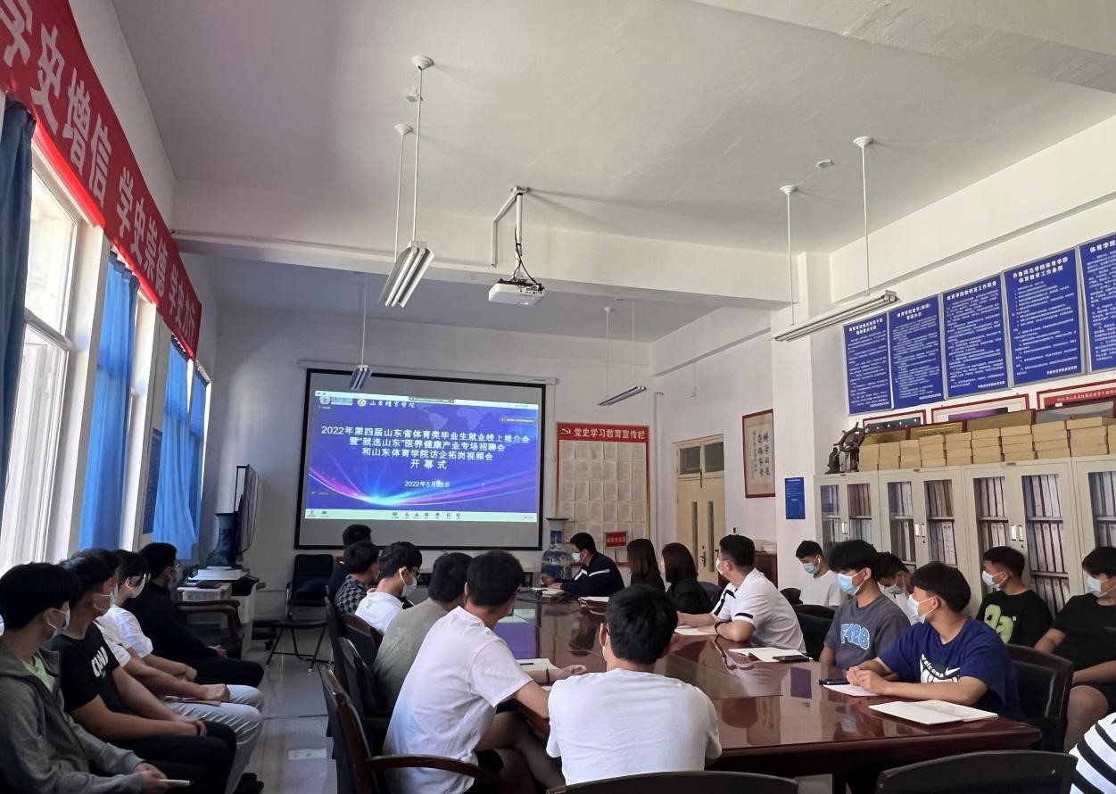为贯彻落实我校关于2022届毕业生就业工作的决策部署,更好地帮助我院体育专业毕业生就业,5月26日至27日,体育学院组织毕业生及部分2019级本科生参加2022年第四届山东省体育类毕业生就业线上推介会暨“就选山东”医养健康产业专场招聘会和山东体育学院访企拓岗视频会,该会议由山东省人力资源和社会保障厅、山东省教育厅主办,山东体育学院承办,齐鲁师范学院体育学院为本次推介会的分会场,会议采用线上线下结合方式进行。
