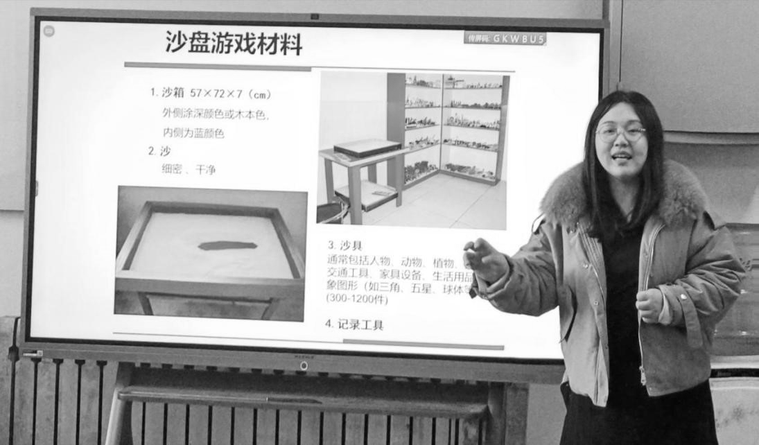 心理老师带领大家通过“蒙娜丽莎”破冰游戏,使大家快速活跃熟悉起来,打破彼此之间的陌生感和拘束感。同时,介绍了关于沙盘游戏的历史、沙盘游戏的适应特征和沙具的象征意义。
