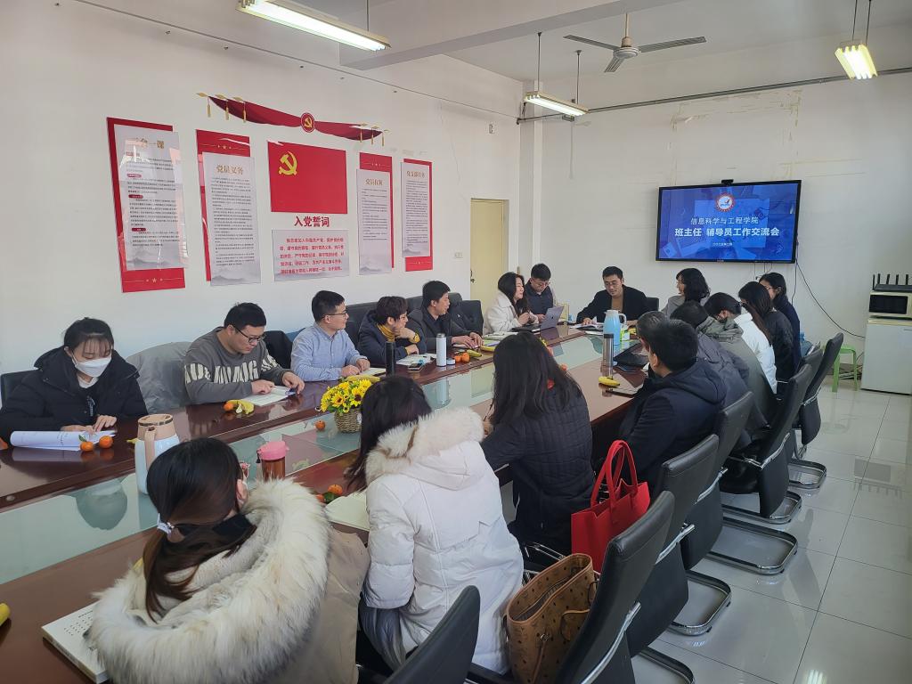 为宣传贯彻党的二十大精神,全面贯彻党的教育方针,坚持为党育人、为国育才,努力做青年朋友的知心人、热心人、引路人,不断提升学院学生教育、管理、服务水平,发挥全员育人作用,打造一支服务于学生的优秀教师队伍,2月23日,信息科学与工程学院召开班主任、辅导员工作交流会。人事处副处长吕玉明、信息科学与工程学院党委书记赵青、团总支书记李绚及全体班主任、辅导员参加了会议。会议由党委副书记姜麒麟主持。