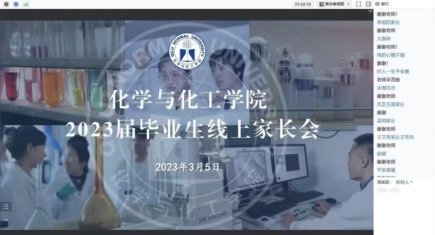 为深入学习贯彻党的二十大精神,进一步强化“家校协作”育人的工作机制,共同帮助学生科学规划未来发展,促进学生更充分更高质量就业,3月5日晚,化学与化工学院召开2023届毕业生线上家长会暨就业工作推进会。学院党委书记郭百灵、院长曹晓荣、党委副书记巩磊、全体辅导员、2023届毕业生及家长参加本次会议。会议由学生党支部书记李钰茜主持。