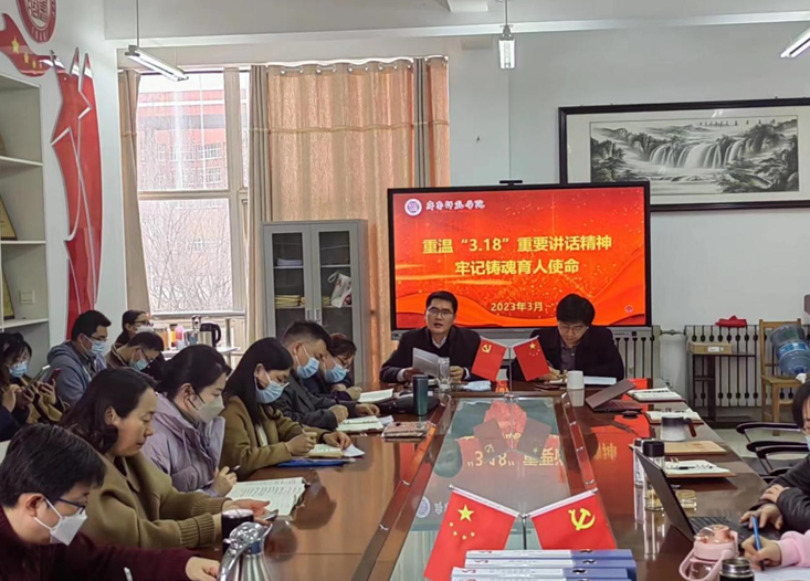 赵立峰带领全体教师重温“3.18”重要讲话精神,对如何进一步贯彻落实讲话精神谈了认识和体会。“习近平新时代中国特色社会主义思想概论”课教研室主任杭丽华副教授、“马克思主义基本原理”课教研室主任孙静静副教授、“毛泽东思想和中国特色社会主义理论体系概论”课教研室主任赵欣副教授分别从自身角度,谈了如何扎实推进习近平新时代中国特色社会主义思想“三进”工作,如何进一步贯彻落实“3.18”重要讲话精神,并就如何将党的二十大精神和“两会”精神融入思政课教学提出具体做法。中青年教师代表张占涛副教授、青年教师代表娄衍群老师结合自身职业成长感悟提出,思政课教师要强化政治素养、坚持不断学习、紧跟时代步伐、自觉修身修为。