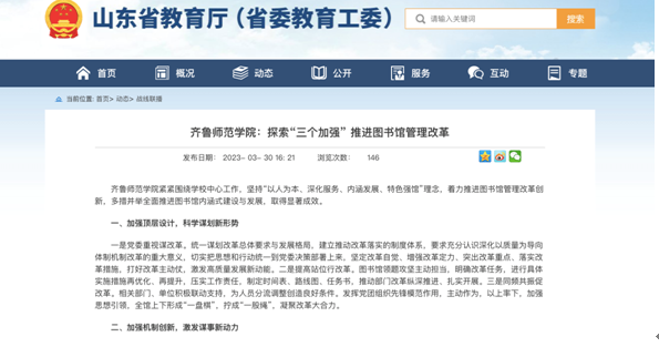 3月30日,省教育厅战线联播栏目发布了《齐鲁师范学院:探索“三个加强” 推进图书馆管理改革》,文章分别从“加强顶层设计、加强机制创新、加强作用发挥”三个方面阐述了学校图书馆管理改革工作所取得的显著成效。