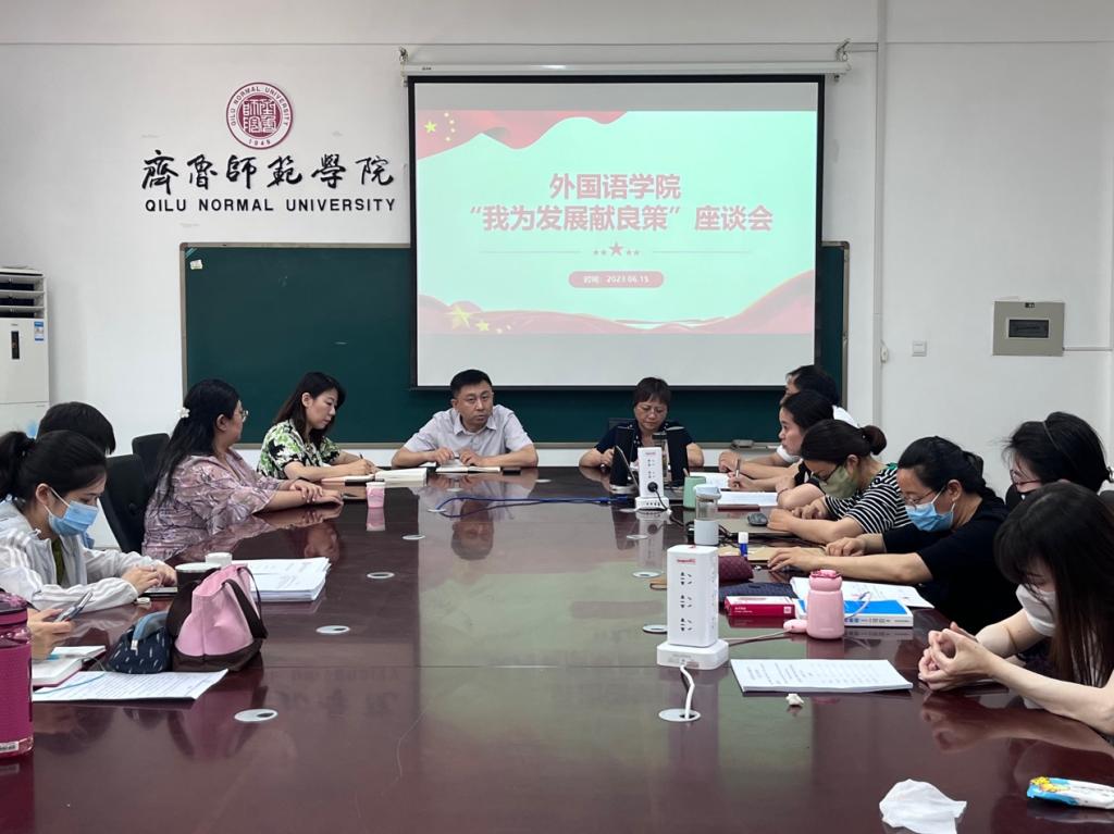 为推进学习贯彻习近平新时代中国特色社会主义思想主题教育走深走实,扎实推进深入调查研究,进一步广开言路、汇集智慧、凝聚共识,助力学校高质量发展,6月16日下午,外国语学院召开“我为发展献良策”教师座谈会。学院院长宋秀葵、副院长谢世金、党委副书记迟英娟、教师代表等参加会议。会议由学院党委书记于江主持。