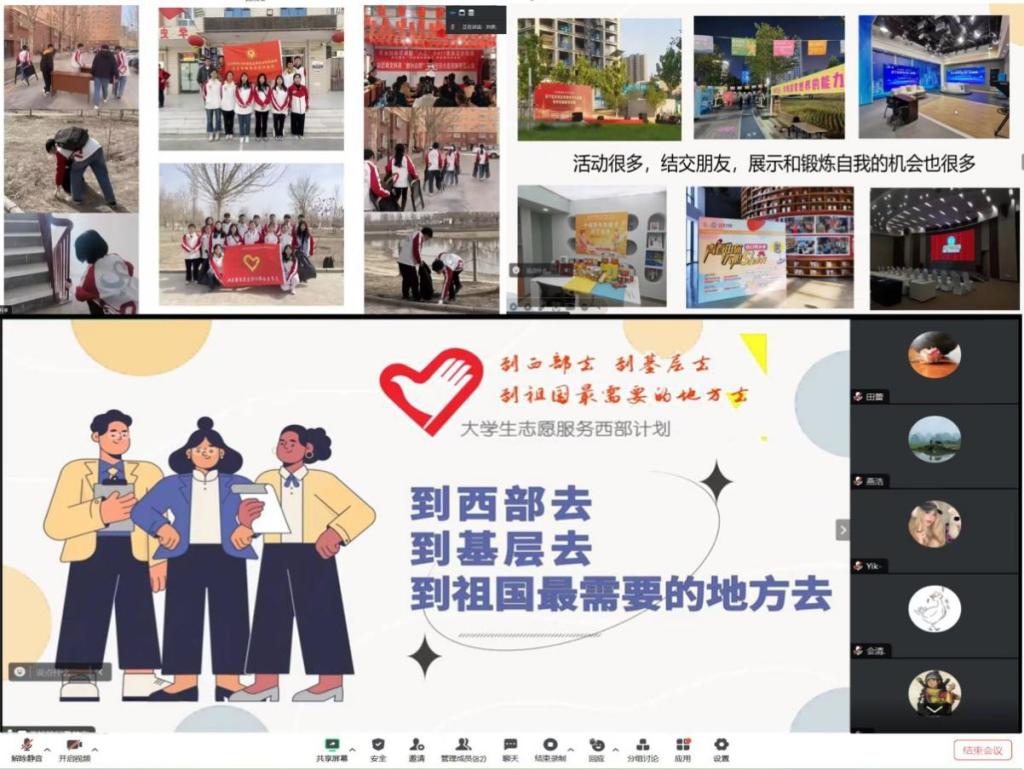 会议邀请参加2023年西部计划志愿者井妍、丛小溪和2022年山东计划志愿者薛钰等校友,向与会同学分享交流了参加西部志愿服务的心路历程和感悟。井妍重点分享了她在新疆的工作情况、服务感受、生活待遇及风土人情,表示参与西部计划是一次锻炼自身的宝贵机会。丛小溪重点分享了参加西部计划选拔的经历,介绍了报名初衷、参加笔试面试的过程以及相关的注意事项,并结合自身情况介绍了同学们关心的岗位分配和福利待遇等问题。薛钰分享了自己参加山东计划两年的志愿服务经历和经验,她以自身案例和切身感受,为同学们提供重要参考和借鉴。三位校友还分别分享了如何克服困难、提升能力的经验和方法,令与会师生深受感动和崇敬。