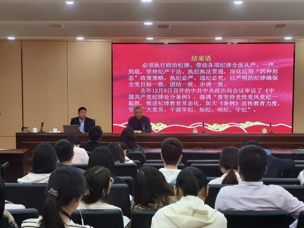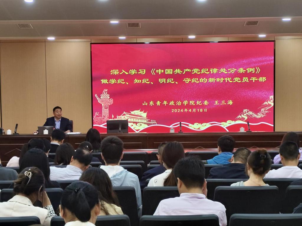 4月18日上午,机关党委邀请山东青年政治学院纪委副书记王三海以“深入学习《中国共产党纪律处分条例》(以下简称“《条例》”),做学纪、知纪、明纪、守纪的新时代党员干部”为主题讲授廉政专题党课。机关党委、文学与历史文化学院教师及学生党员参加,会议由学校纪委副书记于绍军主持。