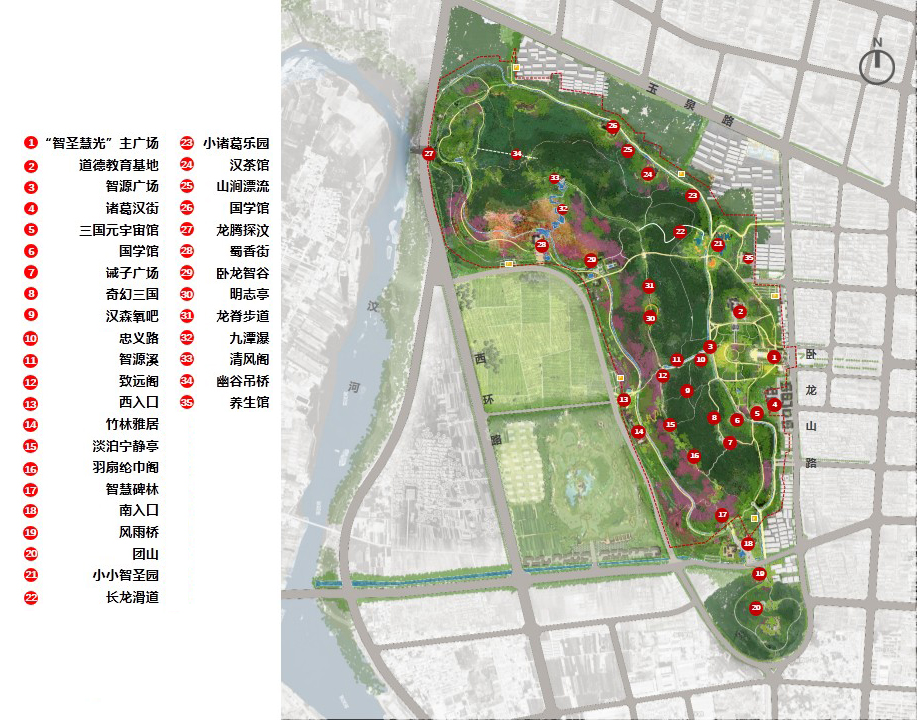 规划提出以建设第四代城市公园、打造景区化城市休闲公园为目标,以诸葛亮文化、两汉文化为底蕴,通过项目化开发丰富休闲旅游业态,针对城市居民及游客的多方需求,引水上山、以水润城、导山入城、山城融合,完善山林观光、文化体验、休闲娱乐、运动健身等多样化功能,形成主题突出、景观独特、业态多元、功能复合、设施完备的山水生态型城市公园。