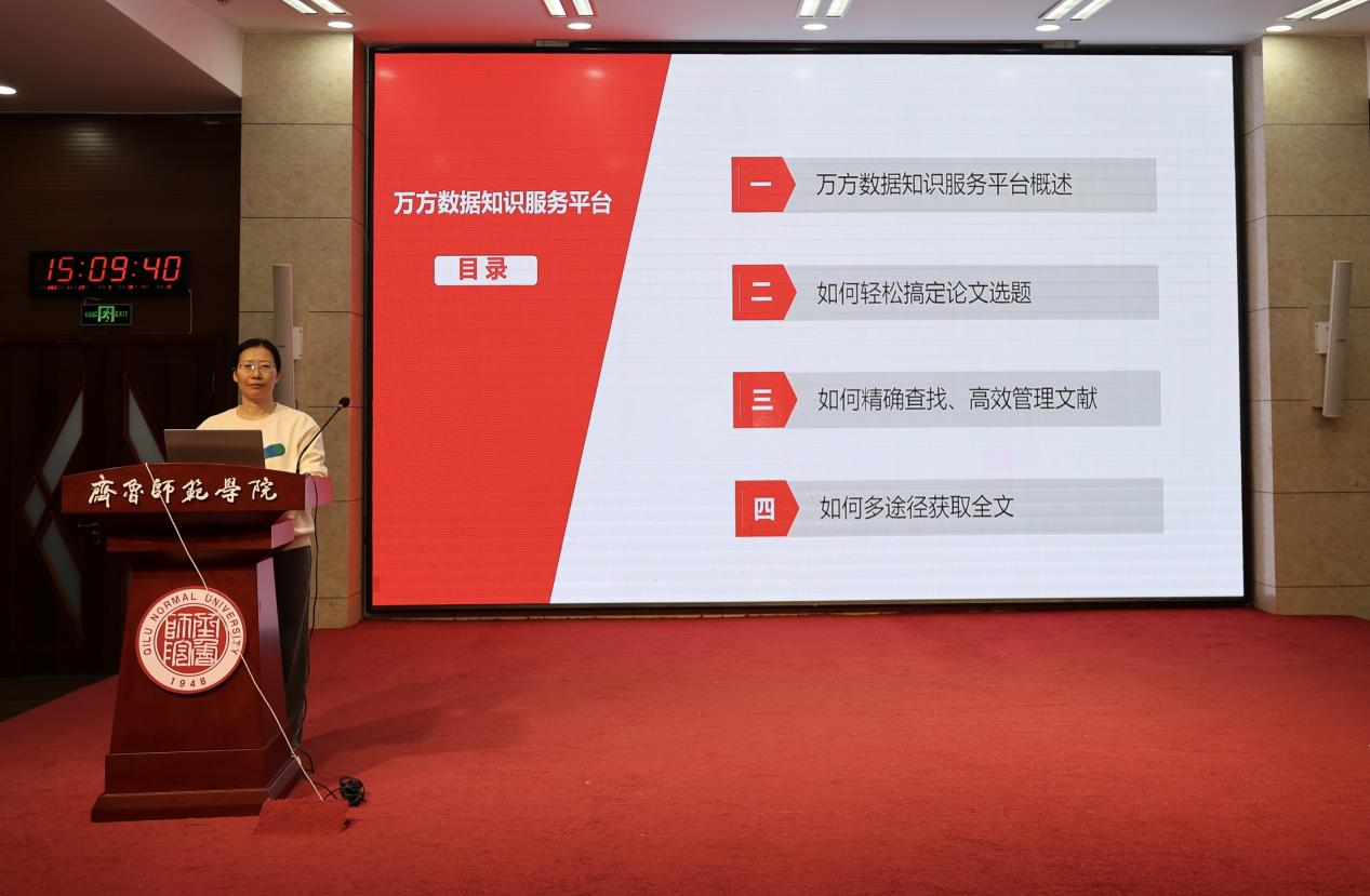 为帮助广大师生了解、掌握电子资源使用方法,提高文献查阅、论文撰写能力,提升图书馆电子资源利用率,11月29日,图书馆在章丘校区第一学术报告厅举办了“巧用万方数据,畅享学术资源”电子资源讲座。万方数据知识服务平台培训师郭展受邀主讲,学校青年教师代表,2020级、2021级学生共200余人参加了讲座。