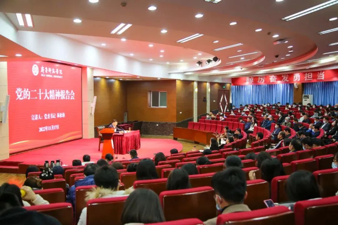 林松柏强调,学习宣传贯彻党的二十大精神要在全面学习、全面把握、全面落实上下功夫,充分认识学习宣传贯彻党的二十大精神的重大意义,深刻领会党的二十大精神的丰富内涵,全面贯彻习近平新时代中国特色社会主义思想,坚定不移把党的二十大提出的目标任务落到实处,切实增强学习宣传贯彻的思想自觉、政治自觉、行动自觉。要以党的二十大精神为指引,坚持为党育人、为国育才,深入贯彻科教兴国战略、人才强国战略、创新驱动发展战略,坚持以高质量发展为主题,深入推进高水平应用型师范高校建设,切实将学习成果转化为推动学校事业高质量发展的强大动力和生动实践。