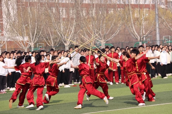 与会人员在学校体育场共同观看了武术育人成果展演,对学生们展现出良好武术素养和精神风貌给予高度赞扬。