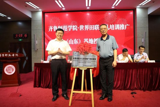 孙楠、林松柏共同为齐鲁师范学院·世界田联少儿培训推广(山东)基地揭牌。