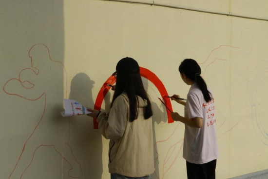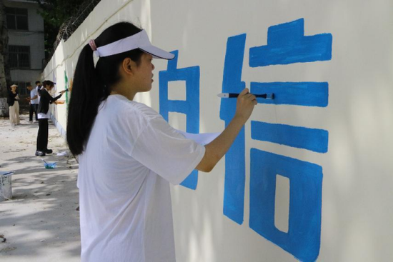 根据好生初中学校风貌和整体氛围,紧扣“向美而生、与美同行”的主题,实践队员以推进美育建设,加强美育教育在农村中小学的落实与实施为目标开展校园墙绘工作。实践队队员头顶烈日,从确定墙绘位置、尺幅、构图,到弯腰、抬臂、起手、落笔、上色,再到细节调整、处理边缘,始终热情高涨,战高温、斗酷暑,加班加点,充分发挥积极性、主动性、创造性,以实际行动发扬“奉献、友爱、互助、进步”的志愿服务精神,用画笔打造乡村基础教育新面貌。