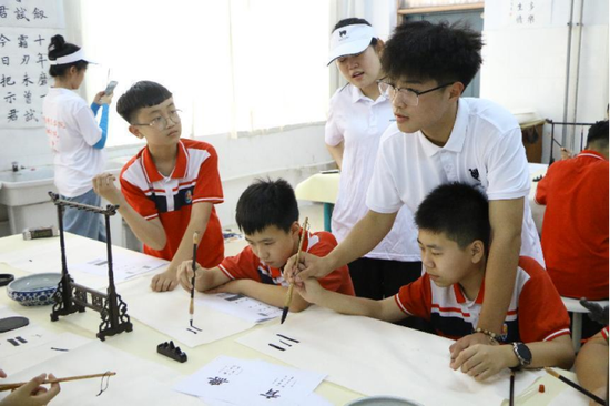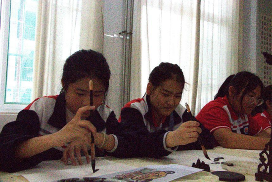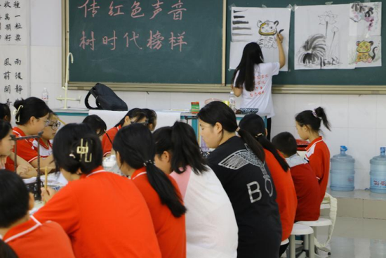 以字为媒,以文会友,传承中华文化。实践队在好生中学开展“传承红色精神 书写时代芳华”书法主题活动。结合建党百年来波澜壮阔的历史,实践队队员们围绕“建新功”“做有为青年”等教学内容,在一笔一划中厚植爱国情怀,书写出中国人的志气、骨气、底气。水墨绘童心,丹青颂中华。实践队面向好生中学的同学们开展国画教学活动。以熟悉毛笔、宣纸、墨汁为基础,从起稿到分染,实践队员们耐心细致地帮助同学们感受焦、浓、重、淡、清的趣味,于笔墨间传承和弘扬中华优秀传统文化。
