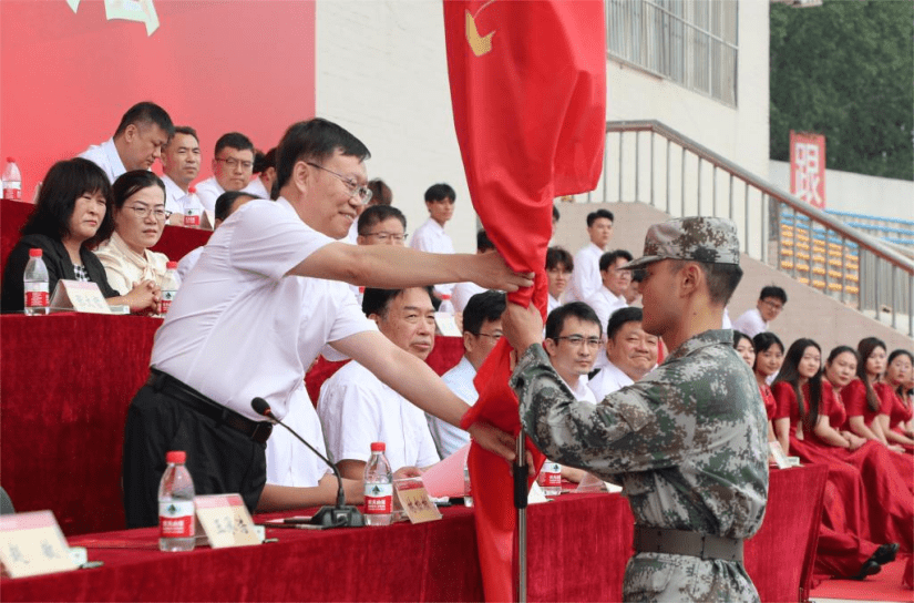 林松柏宣布2023级新生军训开训,并向2023级新生军训团授旗。