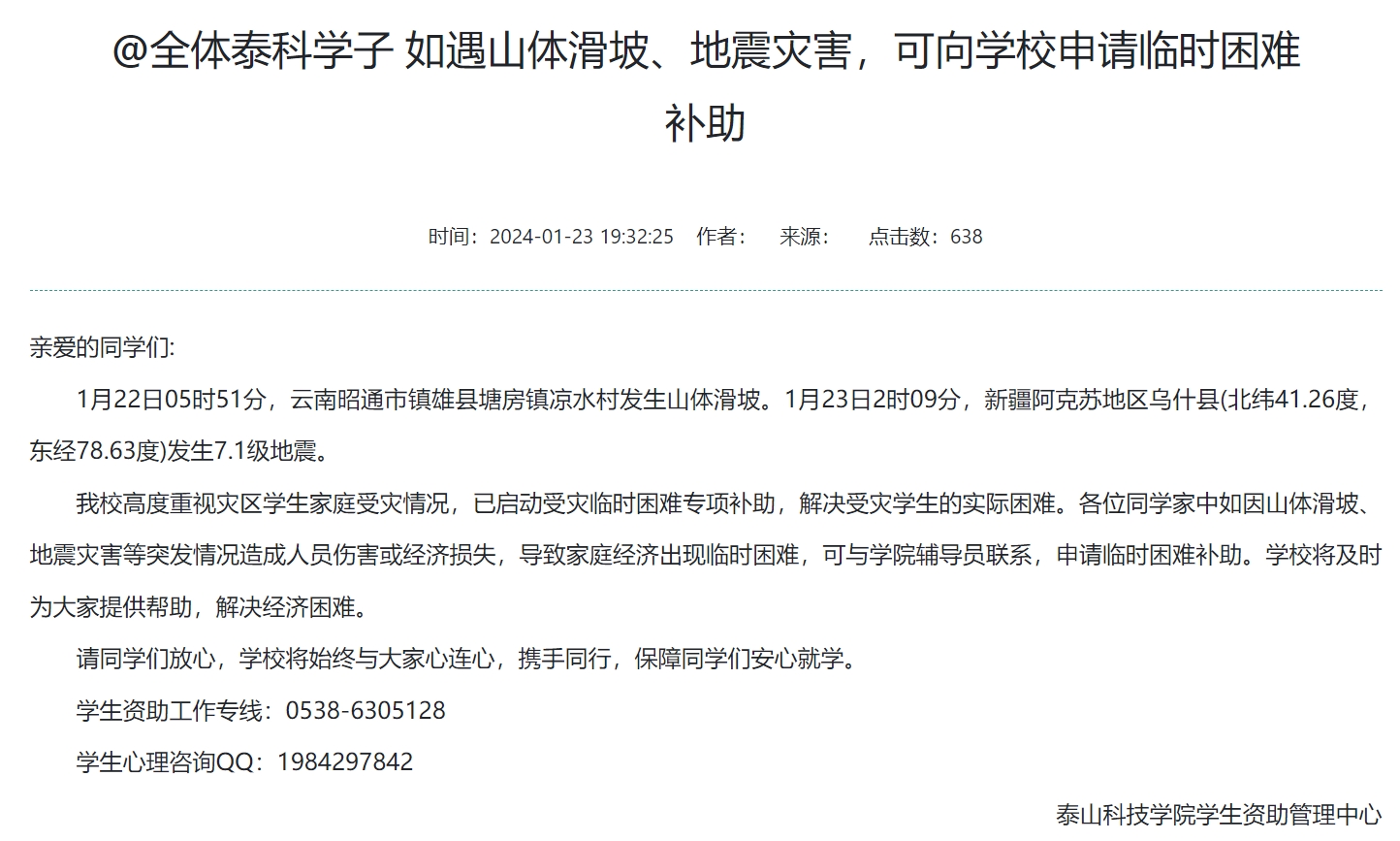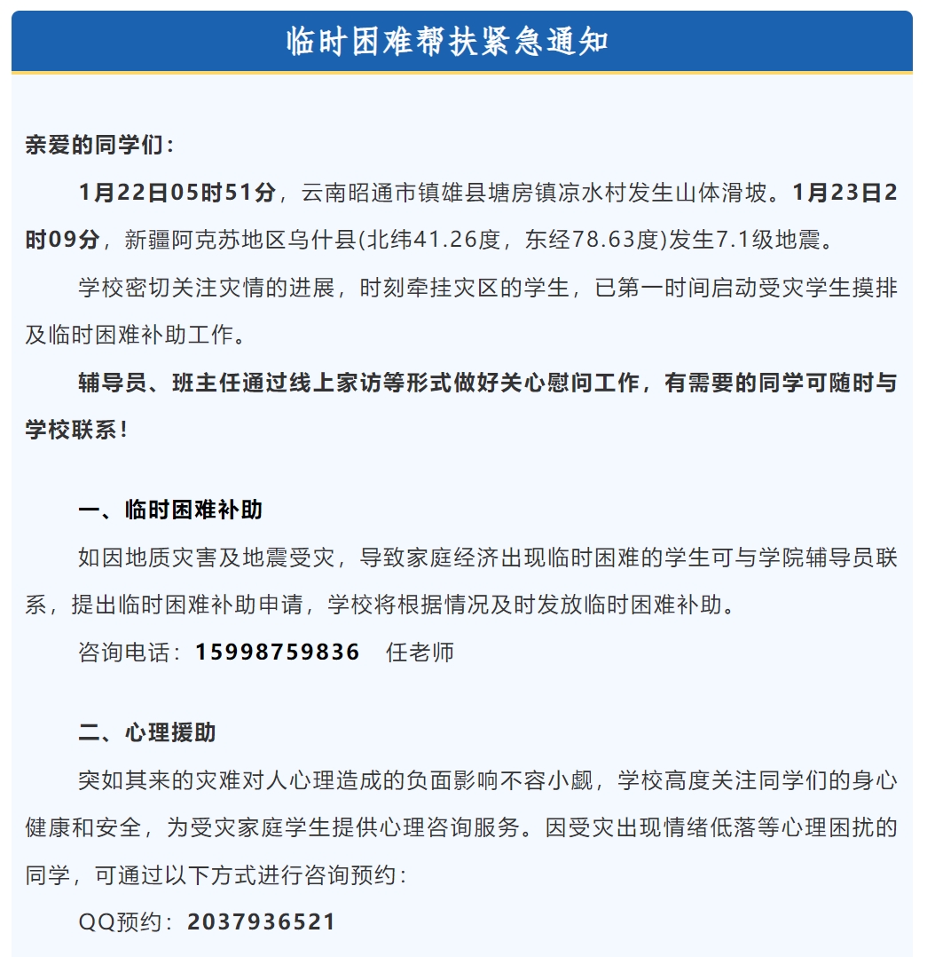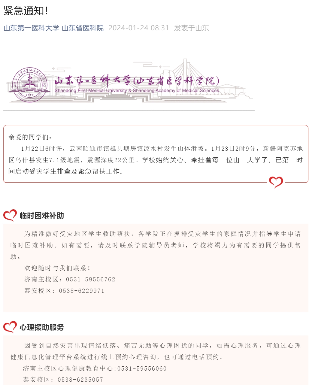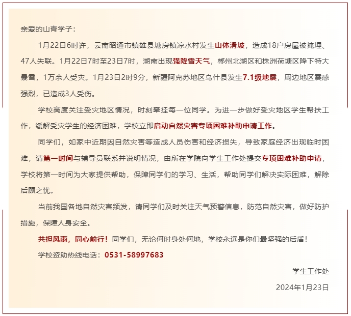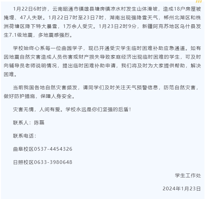 1月23日2时09分,新疆阿克苏地区乌什县(北纬41.26度,东经78.63度)发生7.1级地震。1月22日05时51分,云南昭通市镇雄县塘房镇凉水村发生山体滑坡。为帮助因灾致困学生渡过难关,山东多所高校第一时间启动受灾学生排查,通过启动受灾地区学生专项补助、开通心理咨询服务等方式解决受灾学生实际困难,保障学生安心学习生活。