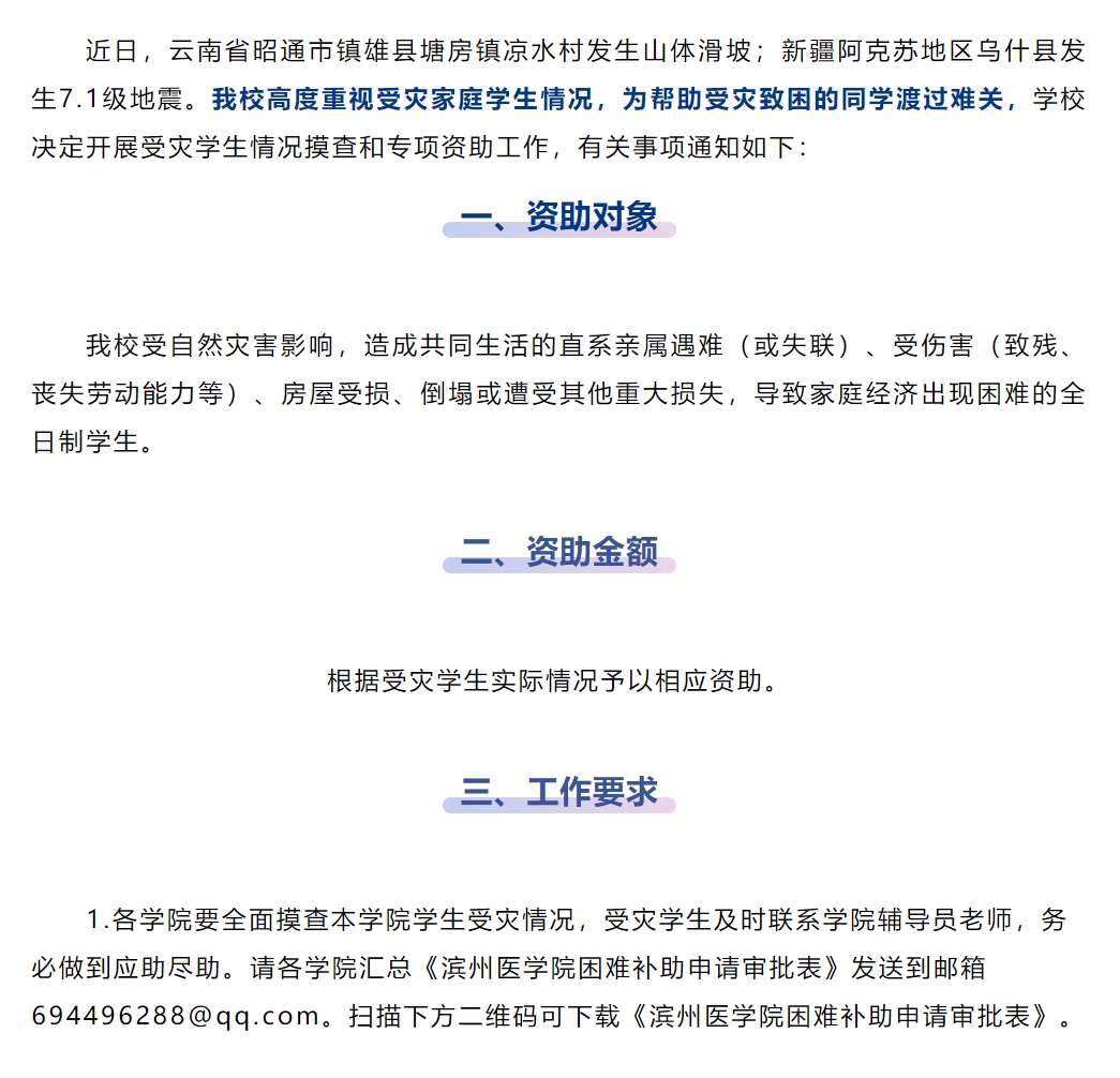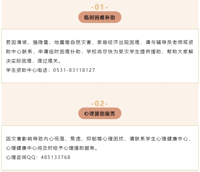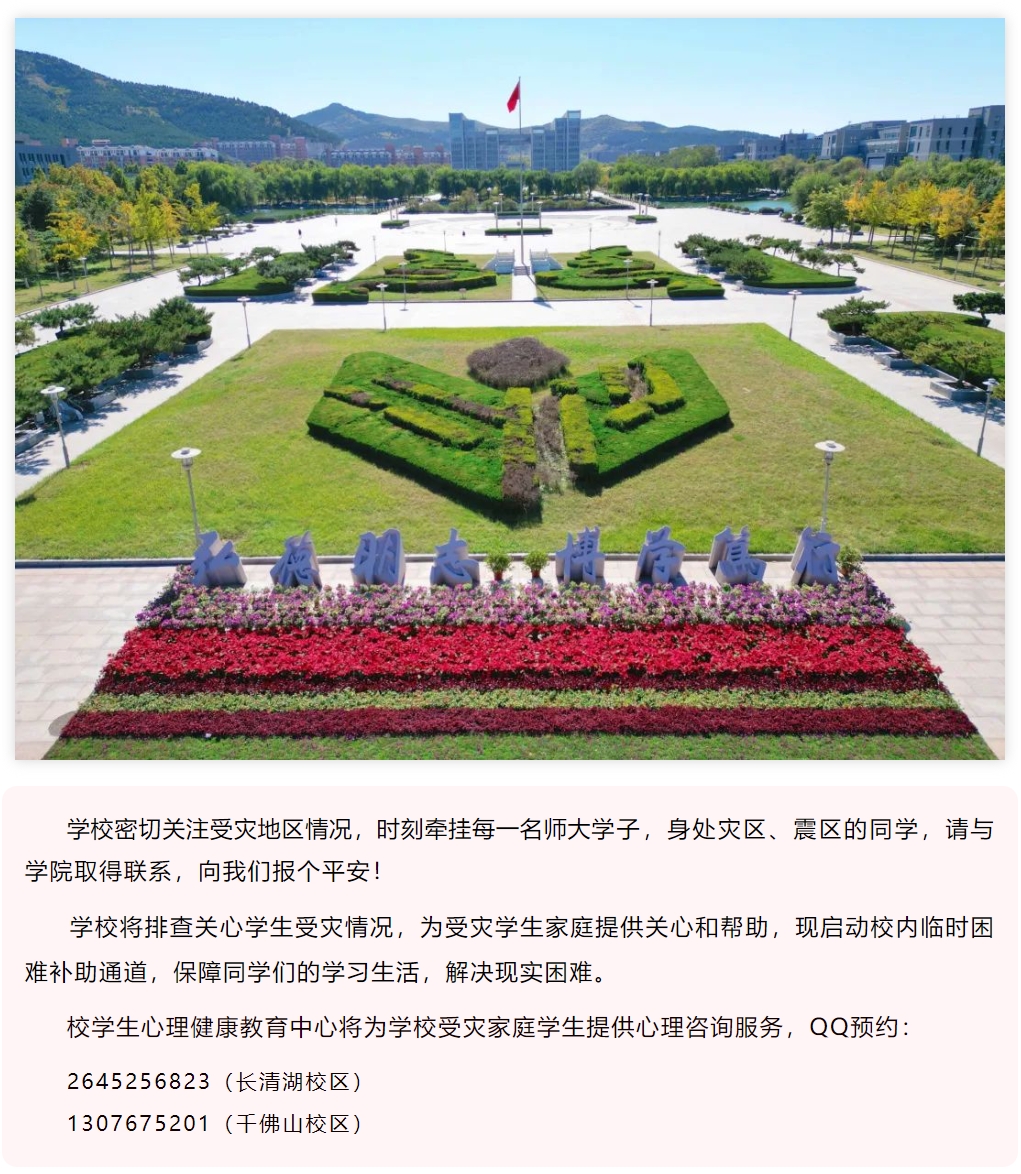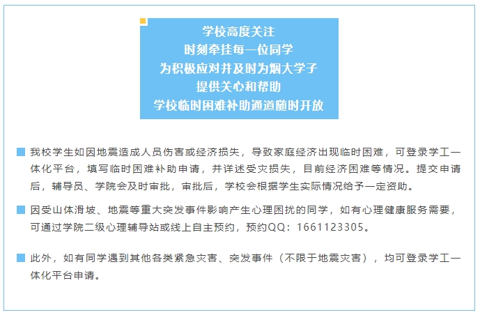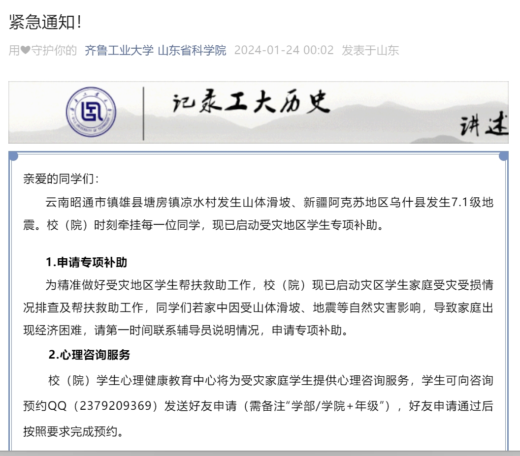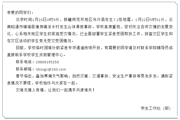 1月23日2时09分,新疆阿克苏地区乌什县(北纬41.26度,东经78.63度)发生7.1级地震。1月22日05时51分,云南昭通市镇雄县塘房镇凉水村发生山体滑坡。为帮助因灾致困学生渡过难关,山东多所高校第一时间启动受灾学生排查,通过启动受灾地区学生专项补助、开通心理咨询服务等方式解决受灾学生实际困难,保障学生安心学习生活。