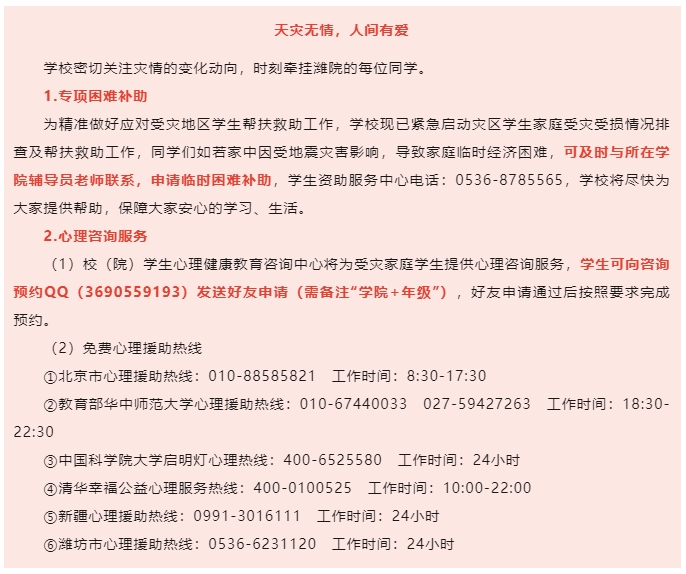 潍坊学院:第一时间启动受灾学生摸排及地质灾害临时困难补助工作