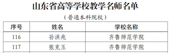日前,山东省教育厅发布了《关于公布2023年山东省高等学校教学名师名单的通知》(鲁教师函〔2024〕4 号),齐鲁师范学院孙洪兆、张克玉两位教授获此殊荣。